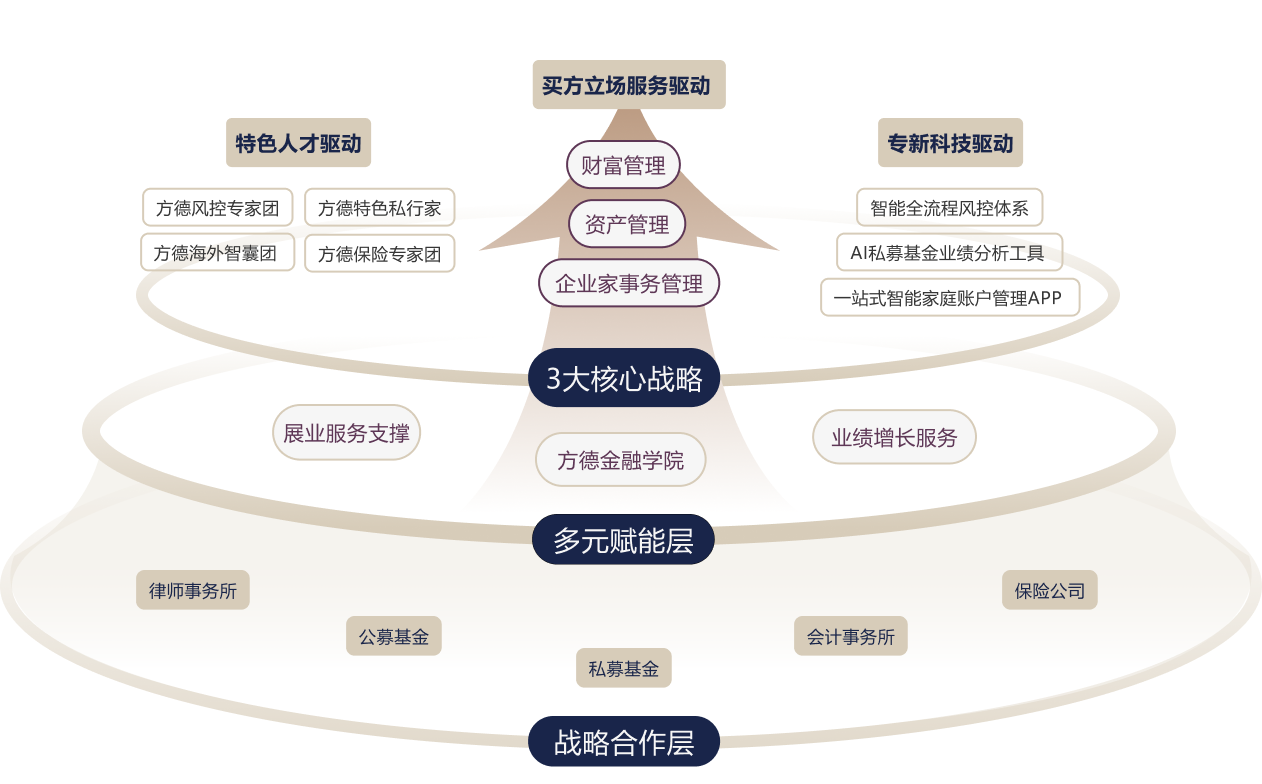 方德围绕高净值客户构建"三位一体"服务体系:以金融学院提供专业支持;通过特色人才、买方立场、专新科技三大战略驱动发展;整合基金等资源,实现"专业培训-智能化工具-全方位生态资源"一站式价值闭环。