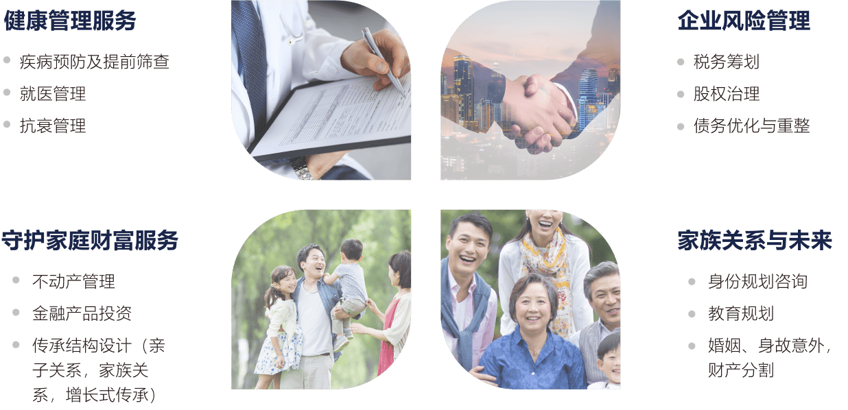 为企业家和高净值家庭提供“全生命周期+全场景”的专属事务管理服务,以“更持久的信任”为基石,围绕您的“增长与传承”核心需求,构建四大服务体系:​从健康管理,到企业护航;从家庭财富守护,到家族未来规划。